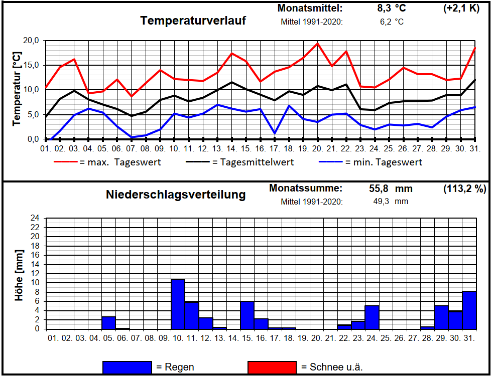 Mit einer Durchschnittstemp. von 8,3°C war der März um 2,1 K zu mild, bezogen auf das neue langj. Mittel 1991-2020. Bezogen auf das alte Klimamittel von 1961-1990 war der März gar um 4,9 K zu warm. Die Max.-Temp. wurde am 20. mit 19,4°C erreicht. Die Min.-Temp. wurde am 01. mit -1,0°C gemessen. Dies war auch der kälteste Tag mit einer Mittel-Temp. von 4,6°C. Die niedrigste Max-Temp. gab es am 07. (8,7°C). Insgesamt gab es nur 4 Bodenfrosttage und nur einen Frosttag. Damit wurde der bisherige Minusrekord an Frosttagen von 2 im März 1990 abgelöst.