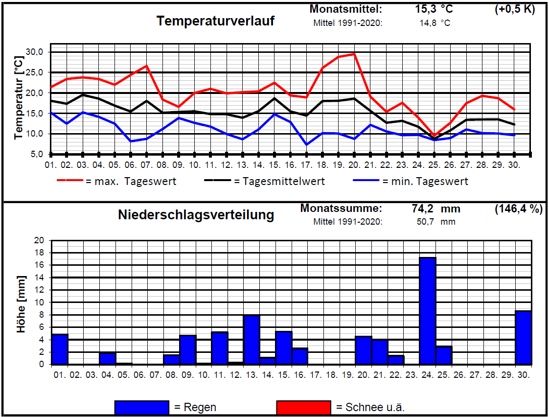 Mit einer Durchschnittstemp. von 15,3 °C war der September um 0,5 K zu warm, nach dem alten Klimamittel von 1961-1990 gar um 1,4 K zu warm. Die Max-Temp. wurde am 20. mit 29,5°C gemessen, im Temp.-Mittel war der 03. der wärmste Tag (19,6°C). Die Min.-Temp. wurde am 17. mit 7,4°C gemessen, nur 2000 (7,7°C) und 1975 (8,0°C) höher. Der kälteste Tag mit einer Max-Temp. von 9,6°C war der 25., auch im Temp-Mittel (8,9°C). Insgesamt gab es 4 Sommertage und keinen Hitzetag.