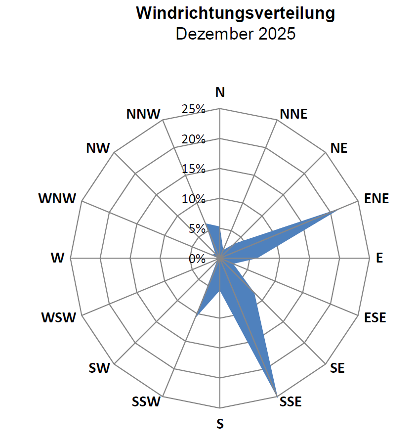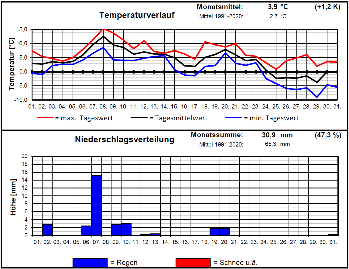 Der Dezember begann, bis auf dem 01. sehr trüb mit für die Jahreszeit entsprechenden Temperaturen, bis auf den 02. trocken. Ab dem 06. Temperaturanstieg auf Tageswerte meist über 10°C, am 08. gar über 15°C, dicht bewölkt und regnerisch. Vom 11. bis zum 21. weitgehend trocken bei Tageswerten zwischen 5 und 10°C, kaum Sonne. In der letzten Dekade winterliche Temperaturen, über Weihnachten bis zum 28. sehr sonnig, danach zunehmende Bewölkung, kaum messbarer Niederschlag. Mit einer Durchschnittstemp. von 3,9°C war es um 1,2 K zu mild, nach dem alten Klimamittel von 1961-1990 war es gar um 2,0 K zu mild. Die Max-Temp. wurde am 08. gemessen, 15,4°C, nur 2022 (18,8°C), 2006 (16,2°C), 1961 (16,0°C) u. 1953 (17,2°C) übertroffen. Die Min.-Temp. wurde am 29. mit -9,0°C gemessen, zuletzt 2022 (-12,2°C), 2012 (-10,7°C) u. 2010 (-12,8°C) noch kälter. Der kälteste Tag mit einer Max-Temp. von 0,7°C war der 25., im Mittel der 29. (-3,7°C). Insgesamt gab es 14 Bodenfrosttage u. 8 Frosttage, keinen Eistag und 12 Frosttage, zuletzt 2016 (14), 2013 (13) u. 2010 (29) übertroffen. Die Niederschlagssumme betrug 30,9 mm, das sind ca. 47,2 % vom Sollwert. Zuletzt 2016 (11,8 mm), 1987 (30,6 mm) u. 1976 (22,5 mm) weniger. Der meiste Regen fiel am 07. (15,2 mm). 12 Regentage wurden zuletzt 2016 (11), 1995 (11) u. 1987 (8) unterboten. An 2 Tagen fiel auch Schnee (29. u. 31.) in kaum messbaren Mengen. Schneedeckentage gab es keine. Es wurden keine Gewittertage und 4 Nebeltage registriert, am Morgen des 11., 13., 20. und 21. Die höchste Windspitze wurde an Heilgabend erreicht. Die vorherrschende Windrichtung war SSE, vor ENE (vorwiegend letzte Dekade). Es gab 5 heitere Tage (nur 2006, 1983 u. 1961 (je 6) mehr) u. 14 trübe Tage, zuletzt 2013 (14), 2013 (13) u. 2000 (14) weniger. Die Sonne schien ca. 35 h. Der max. Luftdruck wurde am 27. mit 1034 hPa u. der min. Luftdruck am 06. mit 1007 hPa gemessen. Max. rel. Luftfeuchte am 20. mit 98 %, min. rel. Luftfeuchte am 27. mit 52 %.
